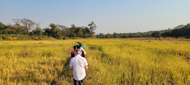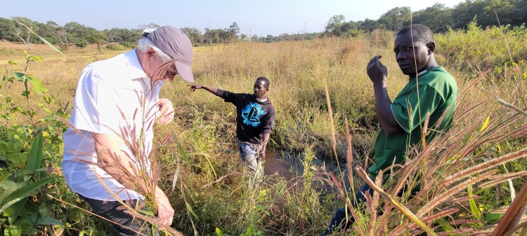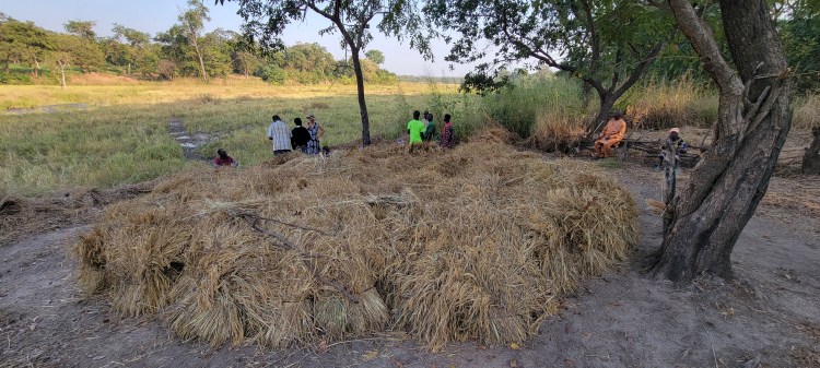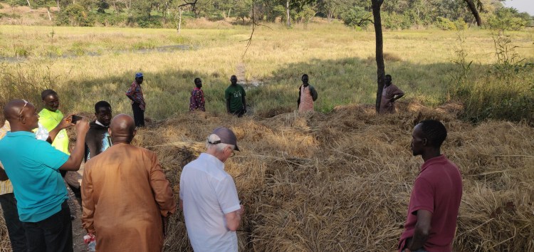 Nous descendons ensuite vers le bas-fond aménagé en compagnie de nombreux habitantes et habitants. La saison de la récolte du riz a démarré. Les aménagements hydro-agricoles : barrage, diguettes, casiers sont en partie cachés par la végétation. Nous constatons qu’ils sont bien en place. Une discussion s’engage sur les adaptations réalisées par rapport au plan initial. En effet la quantité d’eau et son débit ont été plus importants que prévus. L’expérience de la première année de service a permis de les rectifier. Ils permettent maintenant une meilleure maitrise de l’eau.