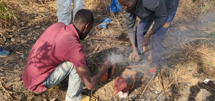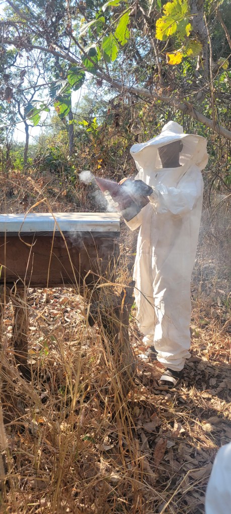 L’après-midi est consacré à la visite des ruches dites « kényanes ». Dix ruches ont été construites et installées dans la savane arborée. Elles ont été fabriquées au village. M. Fodé Cissé, formateur agricole, nous sert de guide pour nous expliquer ce modèle de ruches. Sur place, l’apiculteur et Fodé s’habillent avec les tenues de protection pour inspecter la présence d’essaim dans les ruches. Dans l’une d’entre-elles un premier rayon se développe.